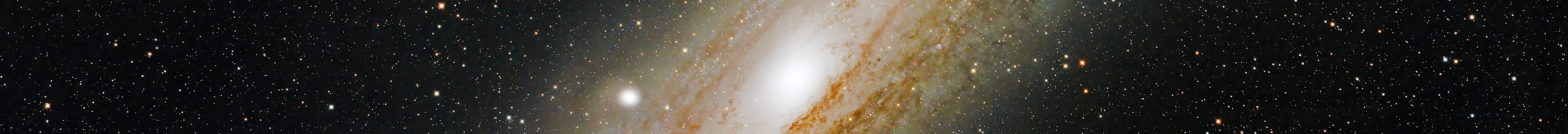 Die Andomedagalaxie ist unsere nächste (große) Nachbargalaxie in 2,5 Mio Lichtjahren Entfernung. Mit 150000 Lichtjahren Durchmesser ist sie twa 50% größer als die Milchstrasse. Auf dem Bild erkennt man auch die beiden Begleitgalaxien M32 und NGC205, zwei kleine elliptische Galaxien